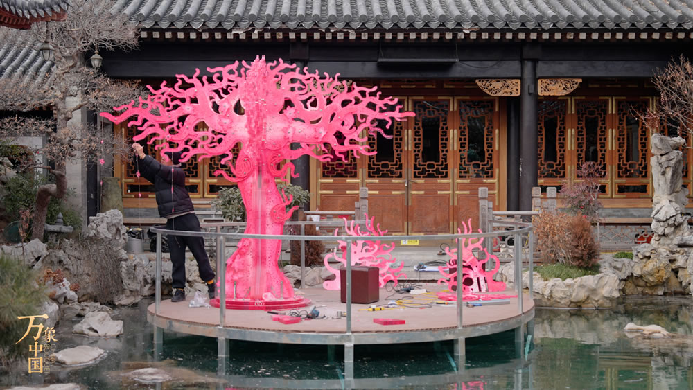 而与蔚县相距数百公里外的北京,剪纸正被赋予全新的表达。当代艺术家崔小清,将这份东方美学刻入创作本能,从甲骨文象形之美中汲取灵感,让剪纸纹样与古老文字相融;更大胆打破二维边界,让柔软的剪纸走出窗棂、走进公共空间。那座屹立于城市中的《桃花树》,成为了传统技艺与当代生活相拥的见证。“这是剪纸吗?”在人们的惊叹中,剪纸不再单薄脆弱,它幻化成这棵桃花树的“筋骨”,亦成为承续古今、联结公众的文脉纽带。