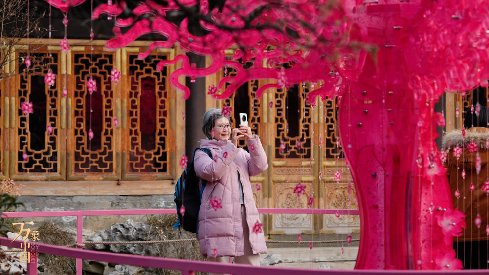 观众打卡崔小清的户外装置作品,在屹立于寒风中的《桃花树》下祈福美好