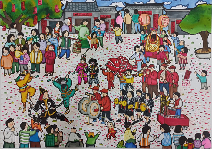 众多人物,各司其职,热闹非凡,喜庆而健康的生活场景。