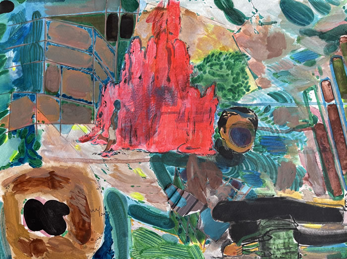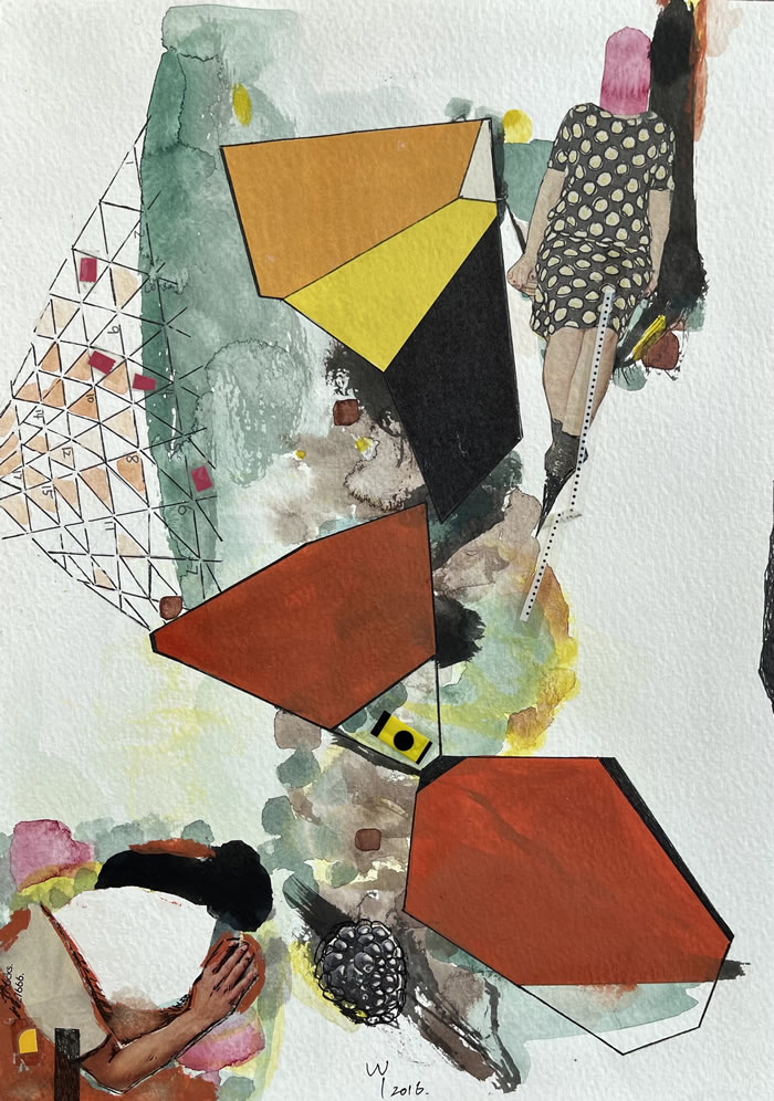 没有彼岸,唯有自渡。或许,创作就是吴烊对抗生命漂泊辗转的方式。近十多年,香港、伦敦、纽约生活时空的转换,连带语言、饮食、身份觉知和认同,客串或长居,主体与客体变换的模糊与清晰,或许曾有期待,有质疑,有调侃,甚至还有些隐喻,对时空对文化的独立思考都融在她每天的生活里,也正是如此,才有了这次展览的纸上水彩拼贴系列。