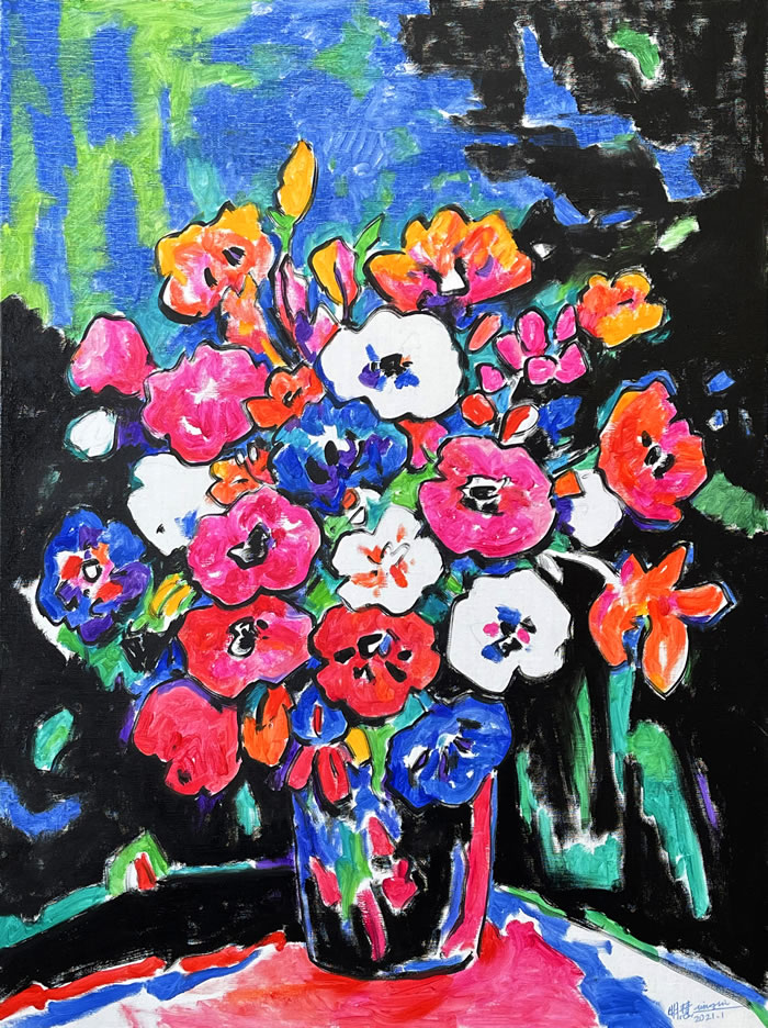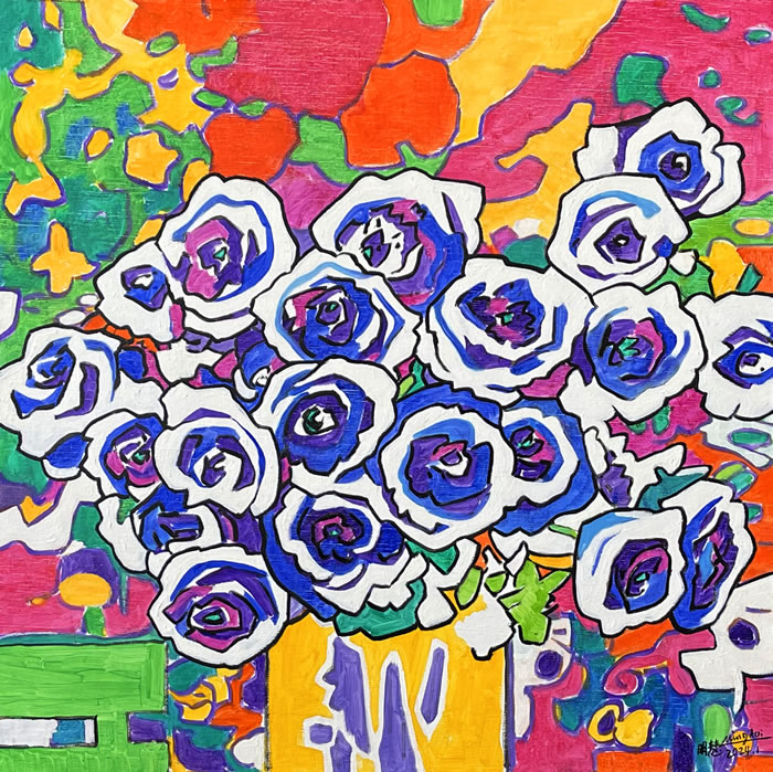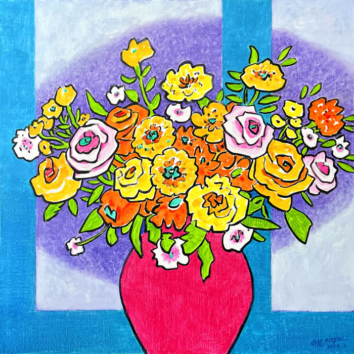 因为爱花儿,我借花画语诉说情怀,借绘画本身把我内心对花儿最美好的愿望锁定在我的画面里。我尝试着用我自己的方式表达对花儿的情感和情绪。我不断地追求在绘画语言上的精简和形式美的探索,不刻意强调画面的立体与空间,而是通过高纯度色彩间的构成关系来营造花儿与花儿竞相斗艳的强烈视觉效果,尽可能地将花儿的美丽与生命力展现得淋漓尽致。强烈的色彩对比是我对花儿的感悟和发自内心的真实情感和情绪表述。