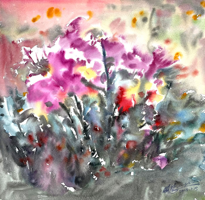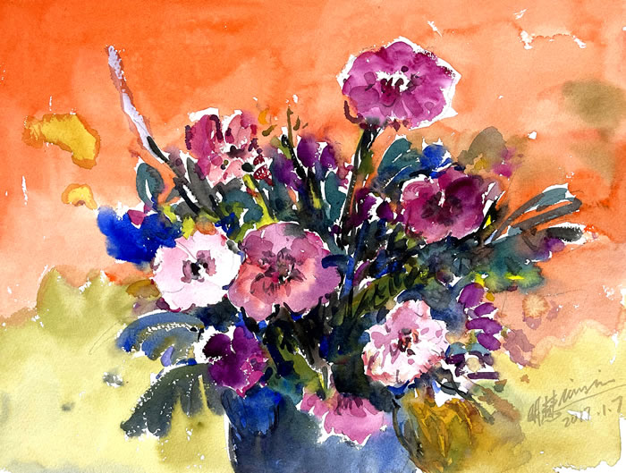 花儿与生俱来的美丽和个性,只有用心去观察去感悟才能真正发现它们内在的美丽和神奇。 在大学一年级学习《装饰花卉》课程的时候我对花儿就有了一知半解的认知。早年的水粉画、水彩画静物写生作品花儿又是我比较喜欢多用的素材。随着对花儿的喜好和认知的提高,从2006年开始我创作了一批干花儿系列作品,2013年以后花卉创作基本上成为我绘画的重要题材。