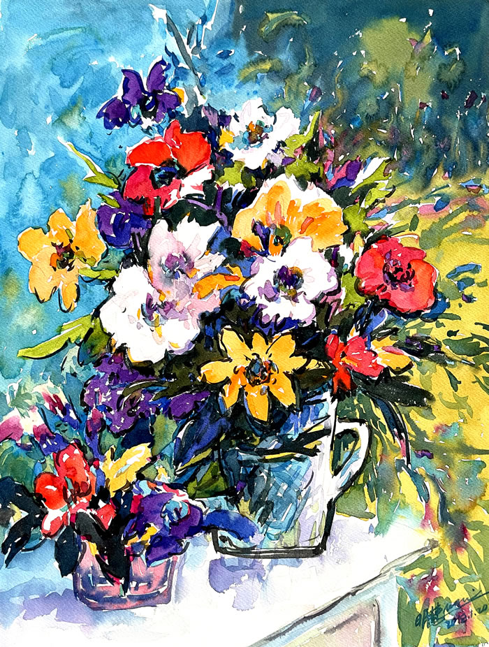 2010年5月的一天,我来到慕名已久的法国吉维尼小镇的莫奈花园,当我走进花园里的一刹那就被花海般的世界震撼到了……在温暖的阳光下,各种花儿竞相绽放,绚丽多彩如诗如画,宛如一道道彩虹,横卧在绿色的海洋中,花香四溢,让人心醉神迷,那满园春色的花海仿佛是生命的赞歌、是心灵的栖息地。我沉醉在这片花海里许久许久,如同心灵得到了洗礼。兴奋、冲动、甚至有些痴狂,我恨不得把整个花园里的花都拍了带回家。此行的莫奈花园深深地触动到了我心灵的深处,让我一生都记忆犹新。从那之后花儿便成为我绘画创作的主要素材,不管走到哪里我都会用相机或手机记录着世界各地的花花草草。2016年5月,我带着事先准备好的写生工具再次来到莫奈花园,当我得知花园里禁止写生的信息后,请求管理人员关照匆匆画了两张值得纪念的水彩画《莫奈花园》和《日本桥》。之后,我几乎每年都要去一次莫奈花园故地重游,我流连忘返于花园里的角角落落,欣赏着久违了的花花草草。我借此感受春天般的美好和丰盈,享受着花开时的动人和美丽,让心灵沐浴在这花香中,品味着生活的甜美和温馨。