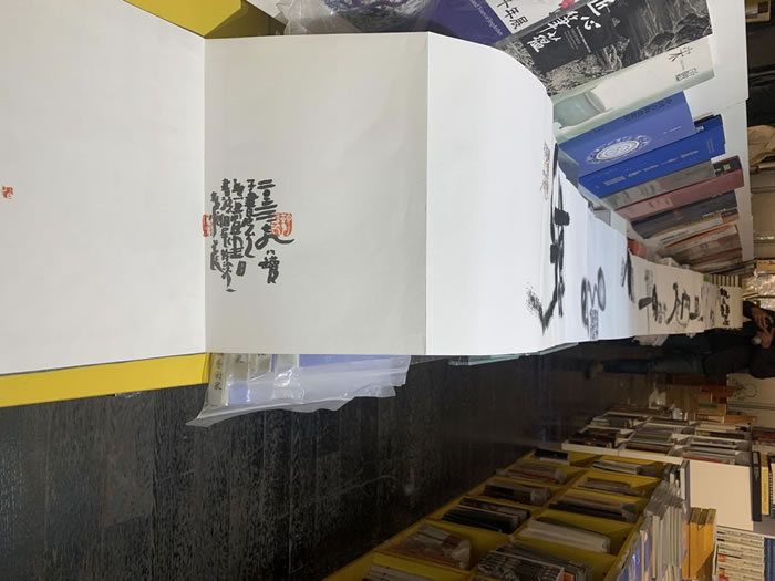 而在书店空间与相临的展示空间展出实验书法作品,本身又是艺术展示空间拓展的实践。在展览空间拓展的基础上,又扩展了书写的边界;在书写作品展示的同时,也重新触发了书店中原有的书籍空间:书之无尽在于书写的厚度,无尽之书在于书写的延展。