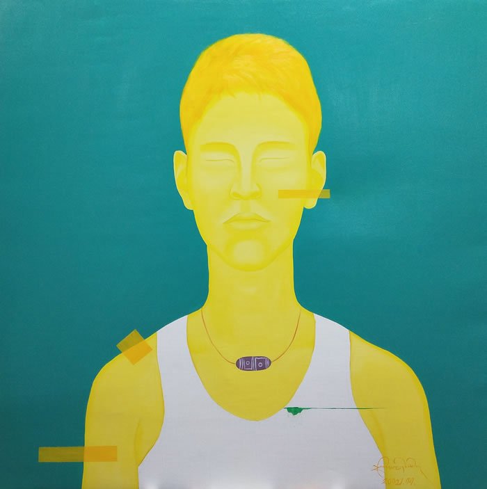 一是横向坐标轴,即放在当代青年艺术家中。在当代的青年艺术家中,赤列德庆的作品具有极高的辨识度。 无论是从用色上的高原色彩,还是在构图及艺术表达上的既西藏又国际、既传统又当代的绘画语言,都有着艺术家独特的艺术语言。“既西藏”,是指他的作品中,虽没有明确指出地域,但明艳的色彩, 喜马拉雅的符号语言,无不让人感觉到画中的文化联结。 “又国际”,是指在绘画语言上, 赤列德庆的早期人像(《自画像》系列、《相》系列等)和近期的抽象人像(《非我像》系列),与国际当代绘画语言一脉相通。