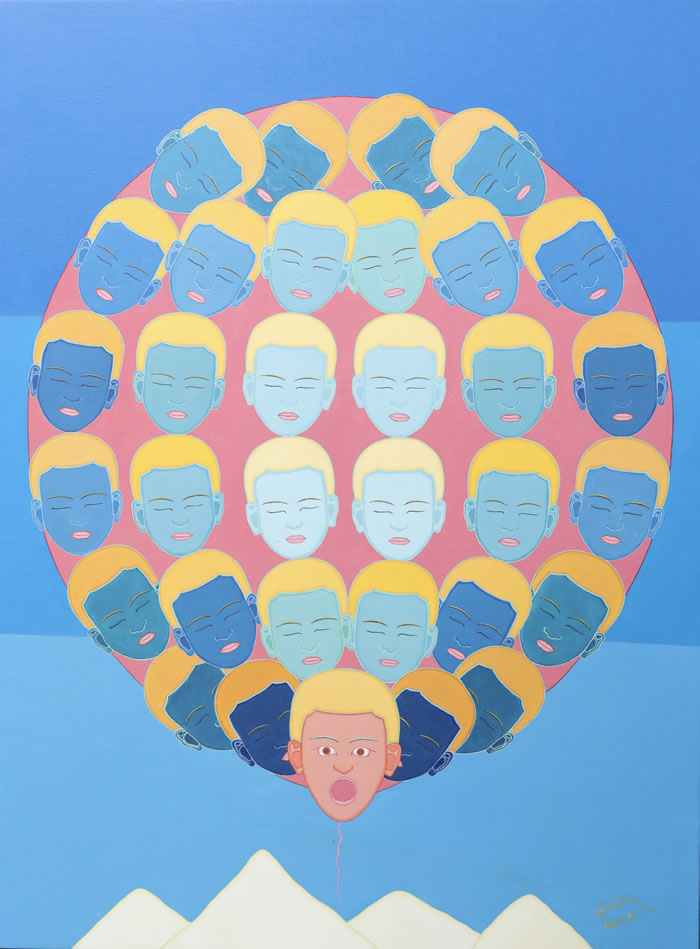 《云》系列是赤列德庆的早期作品,始于赤列德庆研究生期间,也是他从写实油画转向个人风格的第一个创作系列。在这一系列中, 我们没有看到传统的佛教题材,而是艺术家以自身形象来塑造画面中的人物。云,在藏文化中通常含有无常的寓意。艺术家将自我形象塑造为画面中的人物,采用对称性的构图,鲜明的高原色彩,构造出具有神秘感的画面语言。 该系列展现了艺术家的自我迷茫与人生思考, 挣扎与矛盾中却蕴含希望。