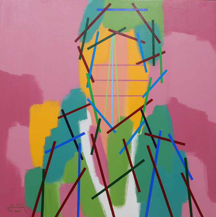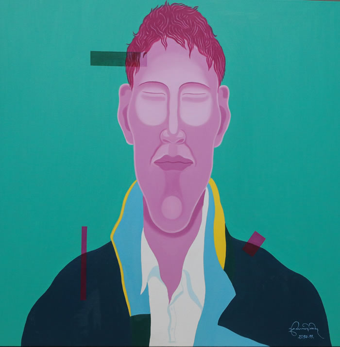 《自画像》系列创作于2017年,是艺术家对自己的审视和思考。 《非我像》系列创作于2023年,是艺术家对自我的重新审视。这两个系列作品,反映了艺术家对于传统艺术规程的脱离和重新思考。 从《自画像》到《非我像》,赤列德庆逐渐突破了“像”的理念,人物形象变成用彩色线条搭建的更简单的、近似于冷抽象的形式,在色块的处理上也由原来具有清晰光滑的界限的色块,变为了边界模糊的色团。