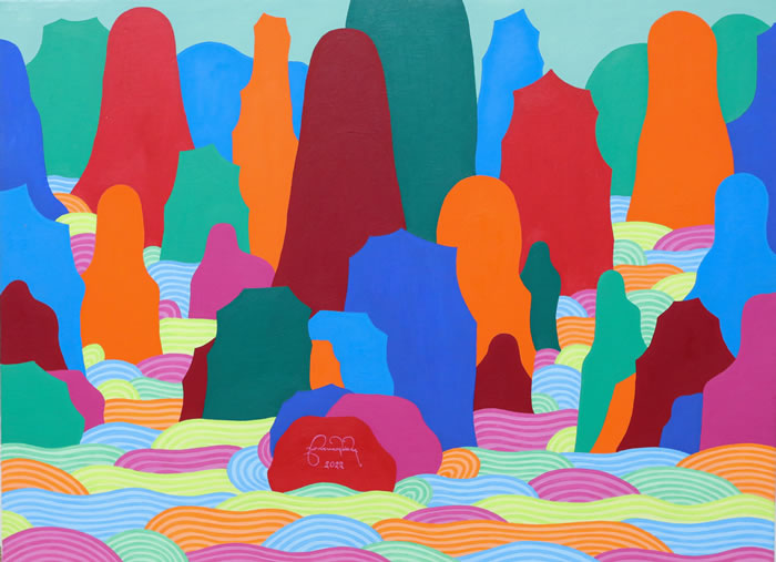 《山水》系列是一种藏文化语境下的对神圣山水的表达,画面中表达了艺术家对于山水及自然的敬畏。在传统西藏文化中,山具有勇敢、踏实、顶天立地的象征意义,水流波纹象征着纯洁与智慧,以及生命的流动与无常。