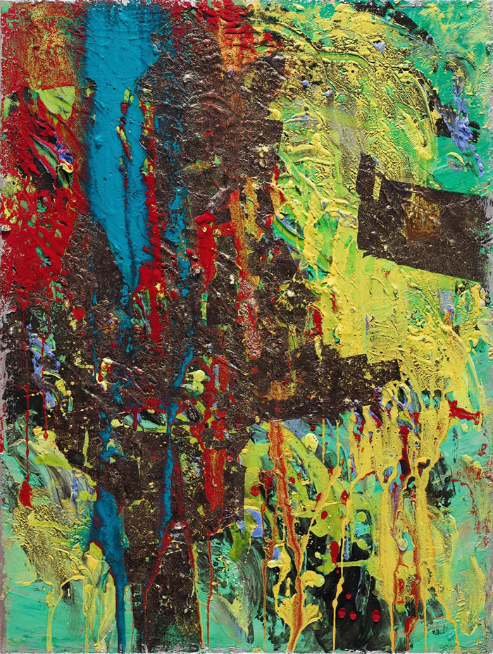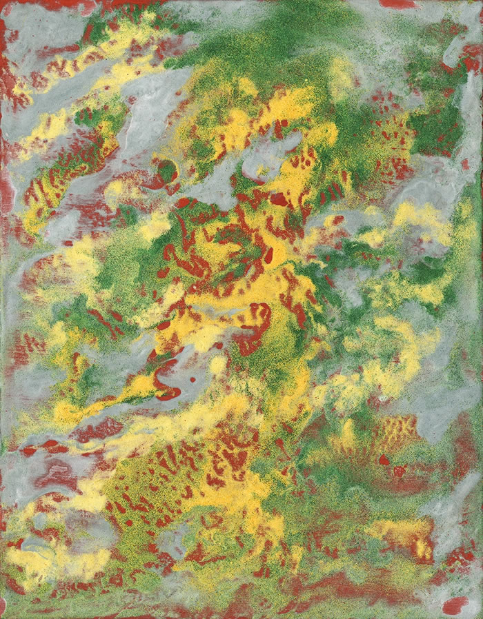 在抽象或半抽象的色彩构成中,诗的灵感左右逢源,诗的幻想自由驰骋,色彩恣意表现的程度、淋漓挥洒的效果,类似美国抽象表现主义画家波洛克的滴色作品。她偏爱的红、黄、蓝、紫四色,像康定斯基“音乐的绘画”的象征性色彩一样,那种色彩构成的韵律似音乐般交响。