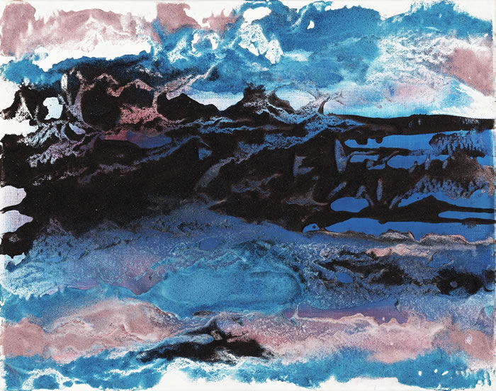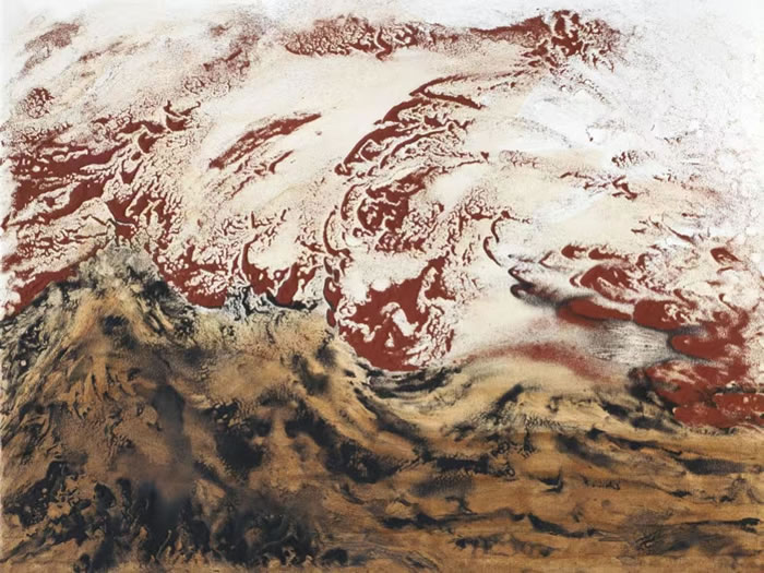 因此她的许多作品令人联想起克孜尔或敦煌石窟那些虽然斑驳脱落却依旧金碧輝煌的壁画;有些作品似乎把中国古代壁画的重彩与西方现代抽象表现主义的滴色融合在一起,流光溢彩,奇幻鲜丽;有些作品的色彩从绚烂之极归于平淡,更接近中国传统水墨画的意境。