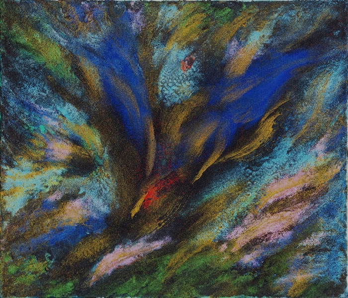 她的岩彩画通过色彩构成表现的诗情,往往是她几十年情感生活记忆中一些闪光的碎片。