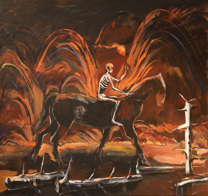 如果说“盗火”带着一种堂吉诃德式的理想与对世界的朴素想象,那么在绘画中如何实现且践行自己的理念,并把现实、理想与想象熔入自己的整个艺术实践中,锻造一个个人化的乌托邦世界,这是艺术家波西米亚式的狂热。火把、荆棘、领袖和诸众反复出现在翟春阳的作品中,荒诞而现实的景观杂糅着艺术史中的经典图式片段,这些构成了翟春阳绘画中充满象征性和隐喻性的符号。在作品《归》中骑着骏马的骷髅举着熊熊燃烧的火把穿越满布荆棘的暗夜,高耸而未知的群山充满未知的压迫感,但是又伴随着火光一起燃烧,作品带着某种浪漫主义的想象,当然无疑更是现实世界的隐喻,正如堂吉诃德的归来,命运是注定的,但身后的世界是不可知的。《天堂》则借用了米开朗琪罗在《创世纪》中上帝与亚当食指触碰的瞬间,在《创世纪》中,上帝从天而降伸出右手食指,向神情茫然的亚当伸出的左手食指注入神明的灵魂,而在翟春阳的作品中,高台上几欲退缩的盗火者举着火把似乎在阻断亚当与上帝的触碰,而台下瞠目而视的诸众紧张地看着这惊险的瞬间。这是一个历史和现实的隐喻。《列宁在我的工作室》则戏谑地把自己瘦弱的身躯描绘成法国大革命时期新古典主义画家大卫《苏格拉底之死》中即将饮下毒酒的哲学家苏格拉底,讽刺的是递毒酒的也是自己的背影,而列宁在红场面向群众演讲的经典一幕在天际若隐若现,似乎在控诉这一切,又似乎在布道。象征性的鹿踩踏着满地枯骨回首张望,没有人在聆听自己最后的演讲,无人在乎艺术家之死,就像苏格拉底,大家听入迷了,忘了老师即将被迫喝下毒酒。翟春阳惯于运用一种像新表现主义画家那样荒凉、恣意且悲怆的画法表现历史和现实的隐喻,正如艾略特的《荒原》(4)所传递的那种萧瑟感。这或许也是“盗火”的隐秘之因。