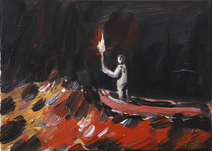 翟春阳的绘画中反复出现擎着火把的人,火把的光芒似乎在指引着某个方向,同时也照耀着无意识地聚集在一起的荒诞的人群。这是一个隐喻——为诸众带来光明与热情的盗火者隐喻,这个隐喻并非普罗米修斯从太阳神那盗火种为人类献祭般宏大,对翟春阳而言,这是一个反复出现在脑海中的形象,挥之不去因而信手涂绘,或许,这个盗火者的隐喻仅仅只是向内的。另一个关于火的隐喻或许更接近翟春阳的真实意图,在柏拉图的“洞穴之喻”(3)中,有一个有意思的推论:如果逃出洞穴的囚犯看到了真实的世界,他将如何说服那些把墙上的影子当作真实世界的囚犯放弃虚幻的执念?这个说服的过程意味着某种危险,因为他出走看到了真实的世界之后,看墙上的影子甚至不如一直呆在洞穴里的囚犯看得更清晰,他的说教很可能被当作某种愚蠢的行为,最后的结局很可能不是为洞穴里的囚犯指明出路,反而有可能被囚犯们孤立甚至群起而攻之。但是如果出逃者盗走了囚犯们身后的火把,或许囚犯们会意识到墙上的影子的虚无性并进而关注到自身存在及改变命运。翟春阳对绘画艺术的坚持以及对艺术圈的疏离一方面意味着对传统理念的悖离,另一方面也意味着精神上的自我重建。翟春阳正是像一个逃出洞穴的艺术家,却又试图回到洞穴做一个绘画艺术的盗火者,他在绘画和艺术上的实践组成了一个绵延的“盗火计划”。