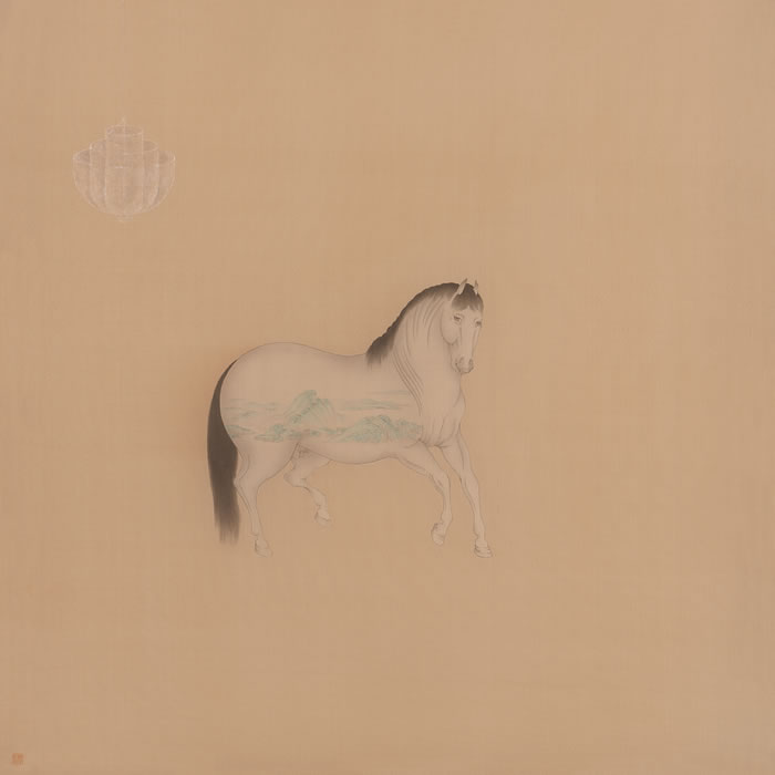 女性视角述情怀。隋宜航的艺术在情感的表达与传递方面,显得异常敏锐和细腻,对日常生活细节的关注,使她能够捕捉到生活中不易感知的情绪波动和不易察觉的灵性瞬间。她笔下的鞍马,即承魁梧矫健、气度雍容的古典样态,又有自信内敛、傲然独立的自我意识。现代灯具等道具的引入,打破时空壁垒,进入超现实的梦境,感官的丰富性与色墨的纯粹性增添了画面的层次和内涵;符号的寓意和有意味的形式,通过“马”与“灯”等器物,构成一种洞察日常与人生的内心独白,充满了女性对日常的珍惜,对生命的关爱。