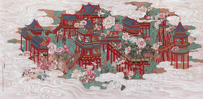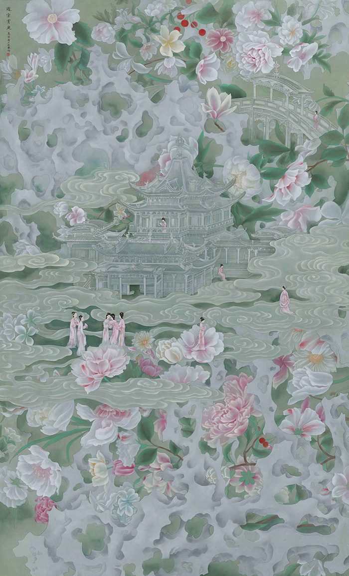 “灼灼其华”取自《诗经》,字面意思是繁花盛开似火,引申意为美丽女子的风华正茂。这也许是最能概述王依雅艺术创作形态的词汇。她的画面上满眼皆是花团锦簇的景象,亭台楼阁掩映,仙女们居游其间,可谓是阆苑仙葩,美不胜收,是超越现实生活的梦境、幻境、仙境。