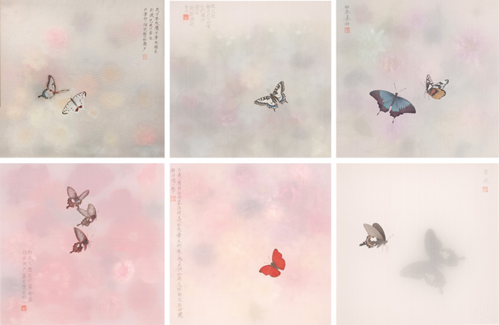 蝶言 30cm×30cm×6 绢本水墨设色、仿生花、蝴蝶标本 2025