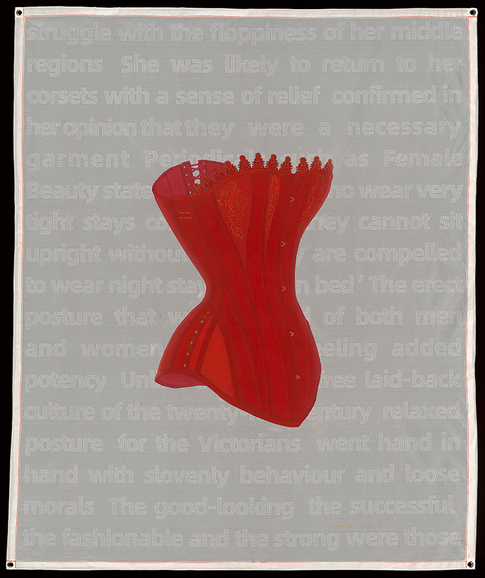 在“繁空录”系列中,王依雅引入了“虚空”的概念,通过华贵夺目的皇后冠,展现了一切荣华终归于尘埃的警世恒言,这也奠立了其艺术的思想基调。随之,“水上安可居”系列描绘的是烟波浩荡的大海中,由亭台楼阁与繁花构成的仙船正驶向自由极乐的永生世界。仙船既是渡过虚妄、艰险、困厄的载具,也是仙岛本身。“痴园”系列则是更聚焦个体的命运,以园林物象为主题,描绘女性们缠绵悱恻的爱情故事,尤其是将西方艺术史上的名作诸如《奥菲利亚》等彩印后与之并置,展现出跨越时间和空间的敏感。最新的“女诫”系列,王依雅尝试挣脱那些诗意的修辞,她用被操纵的皮影、欧洲宫廷的塑身衣、象征禁锢的雕花木板直言不讳,皆是对被缚的女性命运的喟叹。