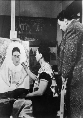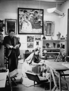 《无题》(弗里达与迭戈在蓝房子的工作室,身后是画作《两个弗里达》)摄影/佚名/1943年/墨西哥城科约阿坎区