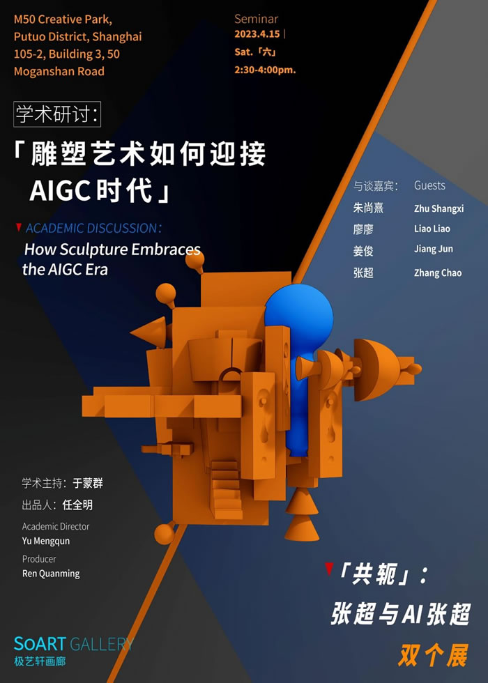 本次展览的“双个展”形式,指的是艺术家张超与张超创造的“AI张超”两位创作的作品。“AI张超”是否可以被视为具有主体性的创作者?是本次双个展希望引发讨论的问题。伴随着基于AIGC(AI-Generated Content人工智能生成内容)技术的大型语言生成模型ChatGPT的爆红,AIGC开始越来越多的介入生产与生活,通过不断创新的生成算法,AI绘画、AI诗歌与AI音乐等领域的成果几乎达到人类水平,甚至有可能颠覆未来艺术创作与交互模式。借此次展览,在展览开幕当天14:30展开主题为《雕塑艺术如何迎接AIGC时代》的学术讨论。研讨会有幸邀请到朱尚熹、廖廖、姜俊、张超共同参与,由于蒙群担任学术主持。研讨会从雕塑艺术的本体性、跨媒介、场域性等特征展开,聚焦张超与AI张超的创作逻辑,以及AIGC所带来的技术伦理、身份认同等问题。
