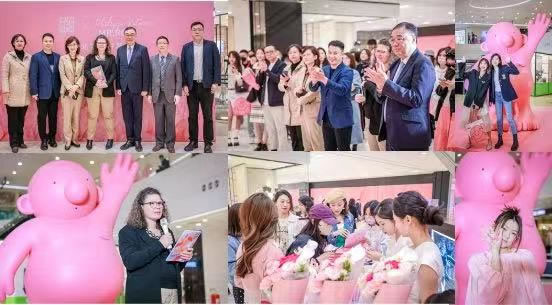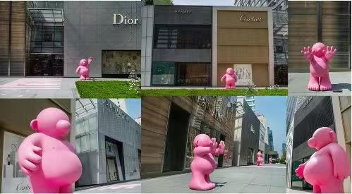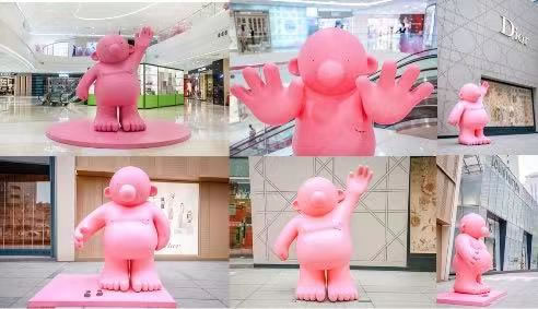 多只形态各异的Mr. Rose已在时代广场准备就绪。身处中庭3米高的“你好,新朋友”以及二层的“抱抱”配合场内无处不在的粉红贴纸,将整个时代广场的可爱值瞬间拉满。憨态可掬的Mr. Rose 举起肉乎乎的小手,让人一眼沦陷进他的可爱拥抱。场外的雕塑群及粉红斑马线也是绝佳出片地点,大面积的粉色空间,点缀在繁华的金融街旁,与时代广场沿街鳞次栉比的品牌外墙相得益彰,妙趣横生的艺术灵感为城市带来沉浸式的治愈体验
