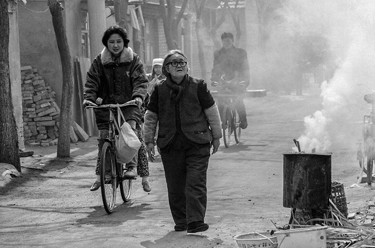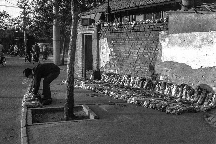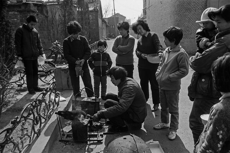 南锣鼓巷 1991.3。北京冬天都是用火炉子烧煤取暖。晚末晌儿炉子灭了,大清早起来头一件事,就是要把炉子挪 到屋外重新笼火。掏出炉灰,点着纸媒子后添劈柴,火苗子上来添煤球,顿时浓烟弥漫满街, 呛鼻子咳嗽,烟眼睛冒眼泪,走道路过的避不开,都紧着走。