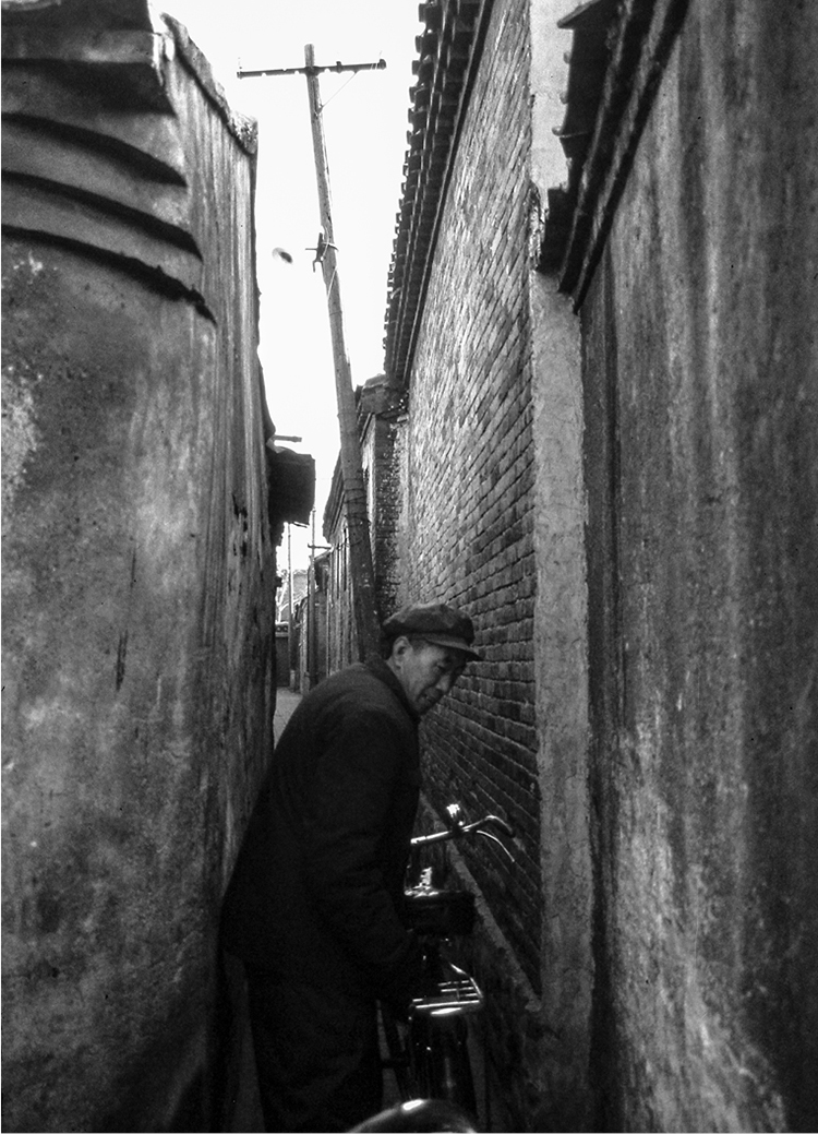 九湾胡同,1991.1,北京城里最不顺溜儿的胡同就数这条,弯儿连着弯儿,弯曲之处不下十来个,是真正曲里拐弯儿的小胡同。不仅弯儿多,还窄棱,最卡脖子处只容一人凑合过,要是俩人走对脸儿,又赶巧在这节骨眼儿同时碰上,俩人就得斜楞膀子错着身横着走。过自行车就更费劲儿了,想掉头就得褪着出来。