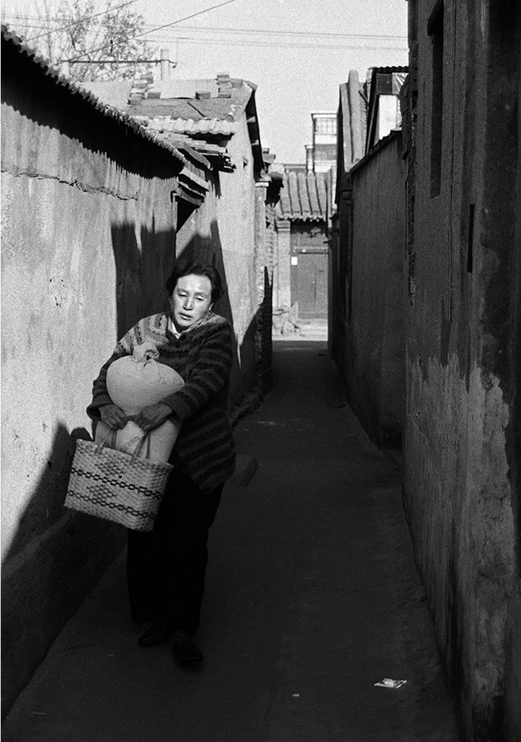 东牛角胡同 1990.11。抱着死沉死沉的十几斤面,一连气儿吭哧这一道可不轻省,搁谁都够呛,何况还提喽着油盐酱醋唔的。远道儿没轻载,呼哧带喘也不歇歇脚缓口气儿。家庭主妇整天操心受累,操持着一家子的吃喝,真是个没辙的事儿。
