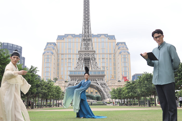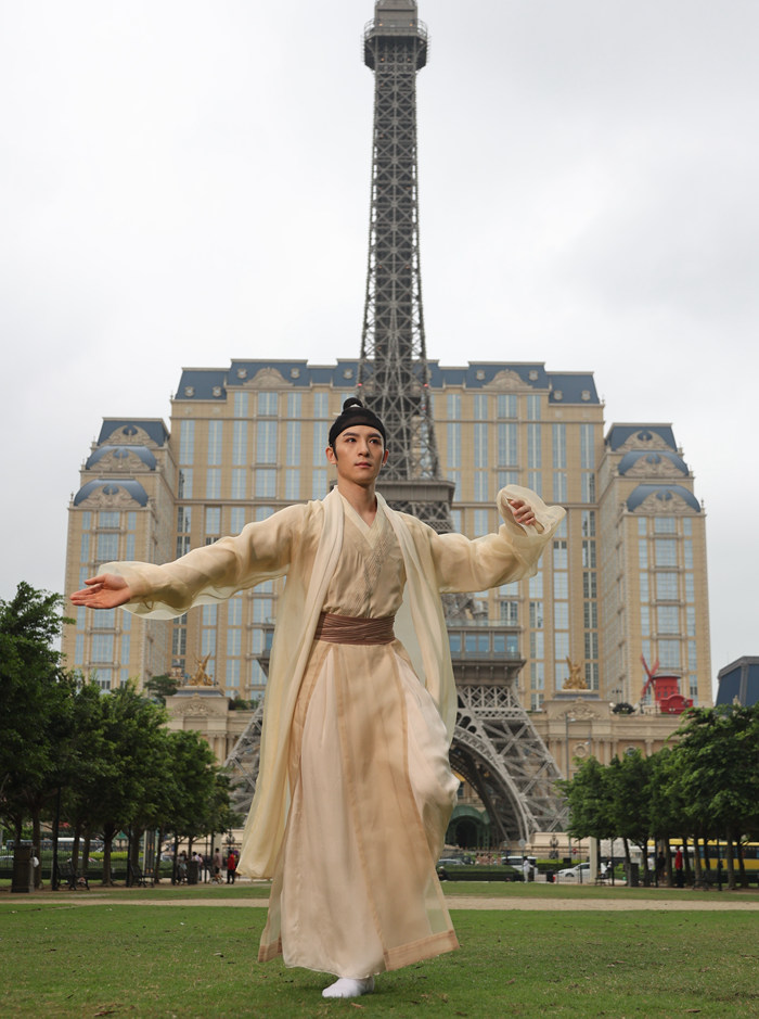 23日,在酷暑难耐的空气中,主创团队还是克服着天气带来的不适深入附近社区进行了拍摄宣传活动。在巴黎人酒店仿真埃菲尔铁塔对面的草坪上,身穿戏服的张翰和孟庆旸以及展卷人谢素豪在镜头下进行着各种优美动作的展示,这些从古代“穿越”而来的“古装客”吸引了大量路人的眼光。不过,在熙熙攘攘的游客中,还是有不少认出来草地上起舞的“青绿”和“王希孟”。有游客在得知八月份“青绿”要来澳门演出的消息后表示,自己到时候一定买票进剧场欣赏“青绿”。当天,在威尼斯人荡漾着微波的水面小艇上,在澳门著名景观——大三巴牌坊前,艺术家们都留下了曼妙的身姿、轻盈的舞步、“青绿”的印记,这座城市数不清的游客有意无意的目睹了“青绿”艺术家们的风采。或许知道他们的人脱口而出“看,那是‘青绿’!”,或许有人并不知道他们是谁,但也会惊叹一句“好美!”。但是或许他们当中的某一位八月份会走进剧场欣赏“青绿”的演出,他们还会兴奋地感叹:“他们曾经来过!”