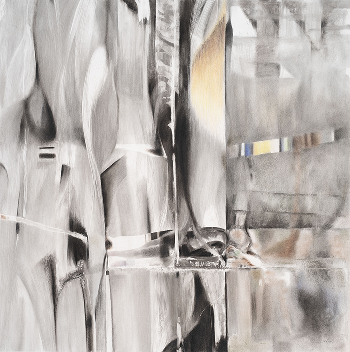 他的近作,如同构架、格栅、渠道、皱褶等的组合,理性的结构支撑和区隔画面空间;有仿若光线、空气、水流、雾霭般的无定形、非定性能量在其中涌动翻腾、奔突流溢。理性与非理性、清晰与混沌、有序与无序、自律与纵情,在这样的二维平面中共构出独特的张力,从视网膜传递到心室心房、大脑沟回……
