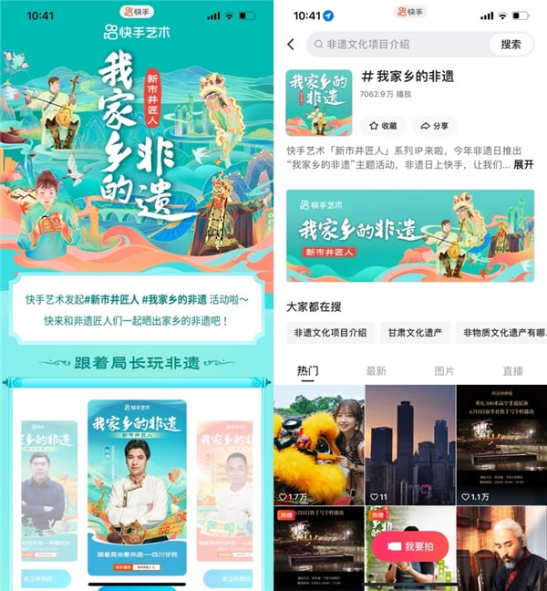在“文化和自然遗产日”到来之际,快手艺术就以非遗城市为主线,于2023年6月1日-6月30日推出「新市井匠人之我家乡的非遗」活动,广邀文旅局长、明星艺人、站内非遗创作者为家乡非遗打CALL。通过非遗技艺与当地文化的结合,活动将立体展示全国各地的非遗保护传承样貌,有效带动各城市文旅产业发展。
