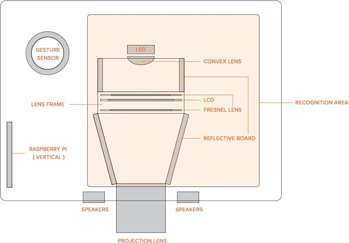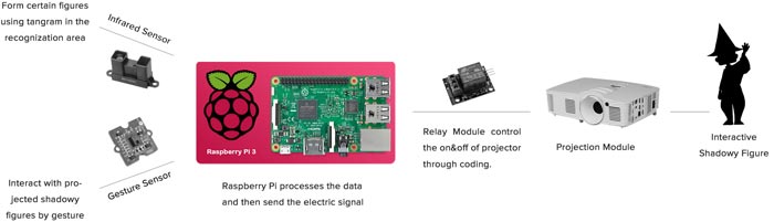 获奖作品 Shadowgram 取自英文单词“Shadow”(影子)和“Tangram”(七巧板),它是一种创新的互动式投影仪,将古老的七巧板玩具与传统民艺皮影戏相结合,通过物理计算和投影技术赋予它们全新的生命样式及互动体验。Shadowgram能够识别1600多种由七巧板自由组合的图案,并将这些图案作为可互动影像,以皮影戏的风格投影到墙上。举例而言:通过七巧板的不同形状,拼合成一个小人图案,在通过内部的传感器识别这些形状,并以皮影戏的风格将小人的图案投摄至墙上,将其从抽象的几何图形转化为一个具象的、可互动的动画角色。孩子可以利用集成在投影仪中的手势传感器与墙上的小人无缝互动,创造一个充满活力和丰富的游戏体验。此时,孩子们不仅可以真实地体验到七巧板这种东方游戏的魅力,还可以由此展开对皮影戏的想象并与之互动,进而展开一场迷人的沉浸式游戏体验。