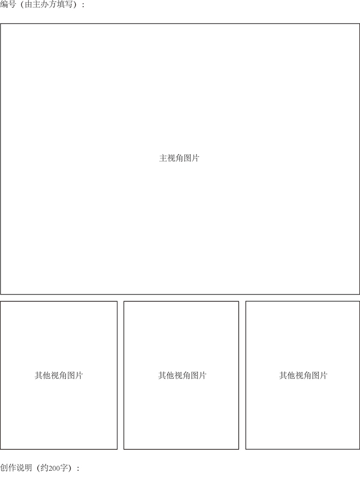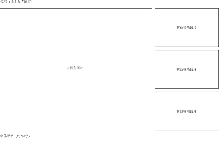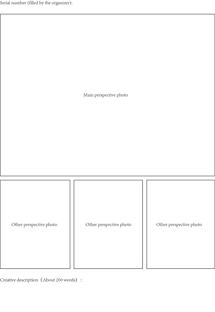 (1) The pictures of artworks can be a picture or rendering of the work, or a photo of the model. Each piece of artwork needs one picture from the front perspective, three pictures from other perspectives, and a description with around 200 Chinese characters. All pictures shall be in A3 size with a resolution of no less than 300 dpi. Please refer to Appendix 2 Template for Submission for the format;