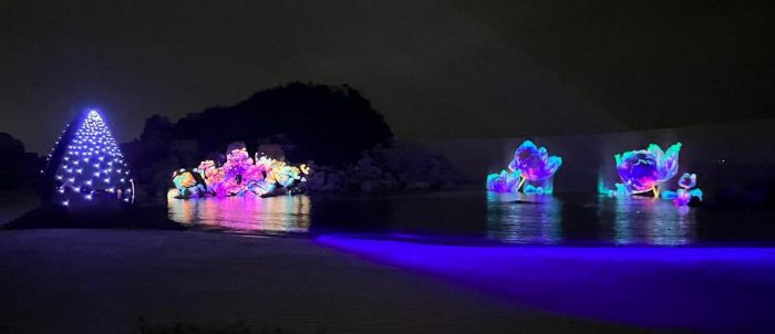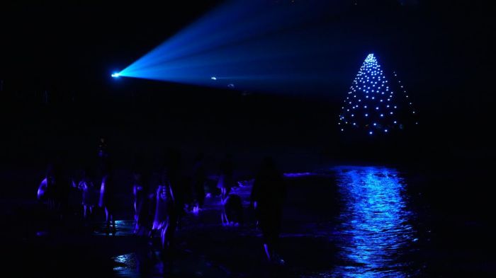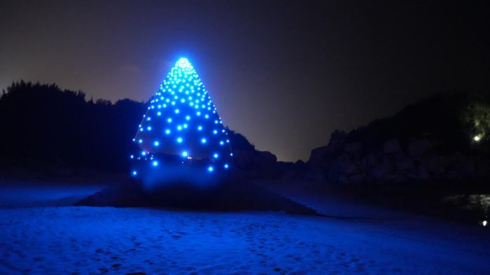 寻求艺术与自然之间平衡、和谐的关系,是景晓雷创作的初衷和原则。“我不喜欢‘介入’的说法,有一种明显后来者的姿态,这样定义艺术与自然的关系是对立语境的。自然的场所本身是具有灵性的,无论沙漠戈壁,还是浩瀚海洋,自然之美是无可比拟的,形态、物种、色彩、尺度……一切关系的存在都是平衡融洽的法则。因此以自然场所为创作背景,对艺术家的挑战是比较大的。我们要做的就是对自然保持尊重、敬畏之心,去融入这个‘关系’,这是创作的前提。”景晓雷在回忆整个设计创作的过程时说,“这次创作对我来说很顺畅,一切就像预演过一样的水到渠成。这里的环境给予我巨大的灵感和创作欲望,我需要做的,就是把这种感受用纯净、单纯、有温度的形式表达出来。而最终的目的,就是让这件作品能够融入、回归到这片海”。“蓝眼泪”从初步创意到最终完成,包括艺术家在内的43人设计、制作团队全情投入下,经历了四个月时间,呈现了一场追求极致的浪漫。