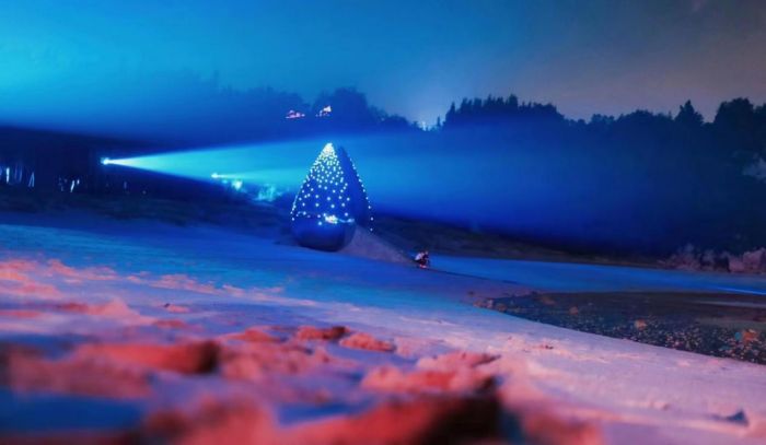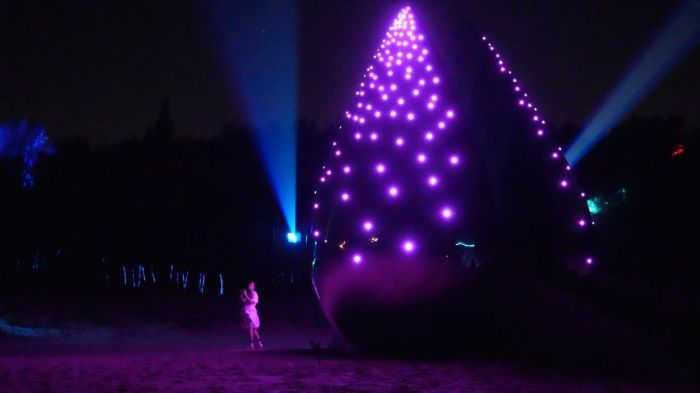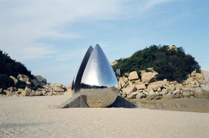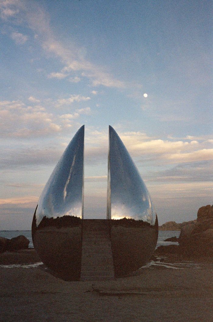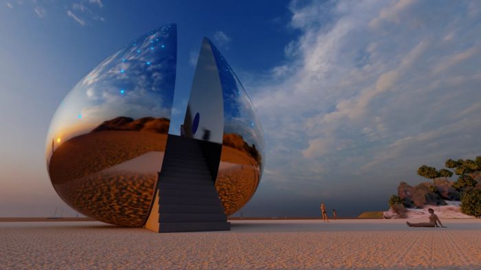 ”这里的自然环境是极简的,沙滩、海平面、天空……这些水平线和大块面是视觉情绪的基点,不能用一些刻意细节去破坏它们。”《蓝眼泪》作品高度8米,宽5.6米,出于对视觉整体的考量,艺术家对于作品的外部形态设计采用了极简雕塑的形式——一颗巨大的“心形水滴”,也是对“蓝眼泪”主题意象的直观呈现。作品表面材质采用镜面不锈钢,简单的形体与色彩,映射周边沙滩海洋,构成视觉的完整性,不突兀、不违和。灯光的设计,主要是表面排布的若干蓝光灯孔,与“蓝眼泪”相互呼应,营造“星辰大海”的浪漫、神秘氛围。