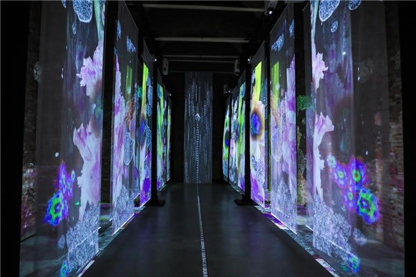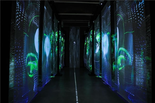 本次展览特别单元作品《源》由NEC新杰克系列与李白短焦系列激光投影机联袂打造。作品以汉字的象形特征为切入点,通过图像叙事演义一段风云变幻而不可逆转的奔流时光,与之对应地平行开启从计算机汉字代码到甲骨文的文字逆向溯源。在这个全沉浸式CAVE空间里,一场动人心弦、蔚为壮观的全息纱幕Show,揭开3000年文明传世甲骨的面纱。观众畅游光影艺境,一步一履,见证语言形式的更迭变迁;一顾一盼,皆是时间与自然万物的表征演绎。
