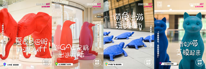 2023年8月1日至9月3日,大连时代广场携手意大利环保艺术组织Cracking Art为城市夏日注入多巴胺活力。40只多彩的动物塑像在时代广场内外形成4个独特的艺术空间,由可回收塑胶制作的巨大动物塑像与繁华的都市公共空间碰撞出的绚烂的艺术创意,撕裂了自然与人造的边界,也唤起市民对于人类与自然关系的反省与思考,加深生态间相辅相成、和谐共处的美好联系。