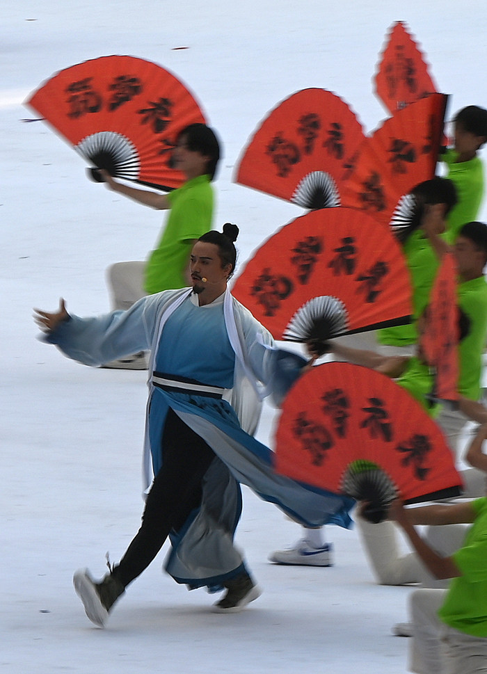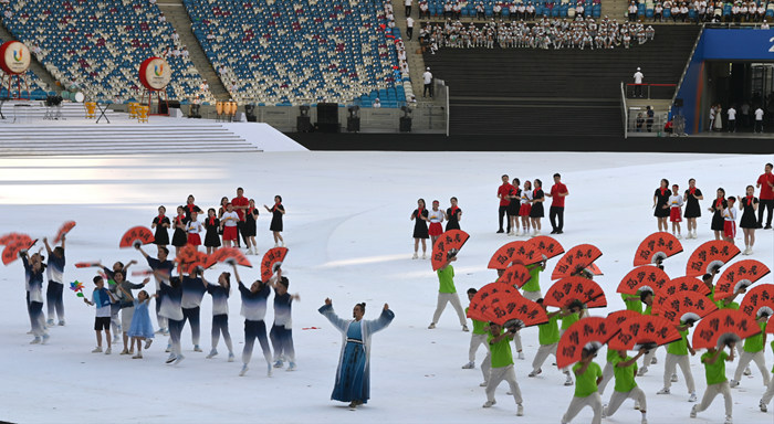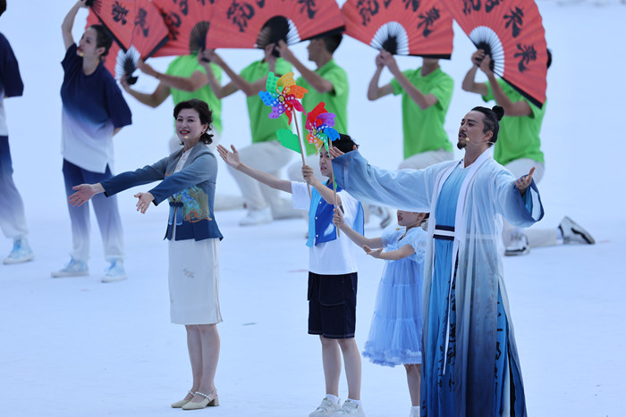 “九天开出一成都,千门万户入画图……”雄伟的音乐声响起,器宇轩昂的李白一席白衣飘飘然出现在舞台上。7月28日,大运会开幕式暖场特别节目《爱在成都》为大家带来一种“四海一家,宾至如归”的温馨之感。饰演母亲的著名表演艺术家董凡和饰演“李白”的谢黎明携手亮相,这两位四川人民艺术剧院的优秀演员带领四川人民艺术剧院、四川艺术职业学院、成都海韵合唱团等100多人的团队倾情出演。