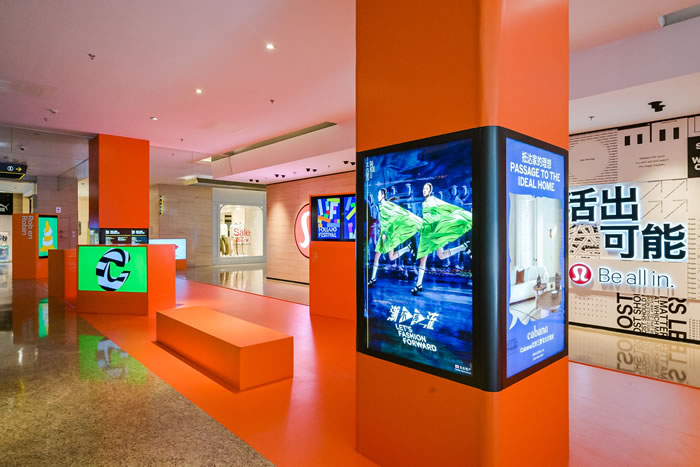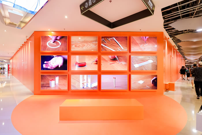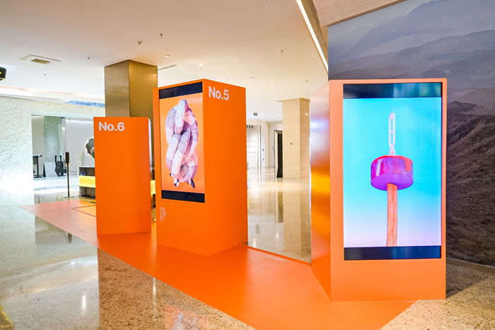 三里屯太古里一直致力于以永不止步的开拓精神携手众多国际一线时尚品牌不断向前,并将国际代表性的时尚元素融入到整个商业、品牌、以及市场活动中,打造“跨界多元”的文化及时尚购物的集合地,为消费者带来全方位的购物休闲体验。本次潮流先锋艺术群展「律动的妙想」在三里屯太古里北区LG层空间设置8个节点,以“流动循环”的视觉体验,打造象征潮流周而复始的“回”字形展览空间,让前来观展的消费者仿若置身循环且流动的图像之中,感受潮流元素在不断碰撞中融汇升华,焕发生生不息的潮流灵感。此次展览以当代“山石”为空间设计概念,用电视屏幕堆叠成假石山,将大自然的原生态与当代简洁、科技化的艺术表达巧妙结合,凸显出反差感与实验性,同时辅以明亮的橙色为主配色,让展览空间愈显夏日的热情欢愉。