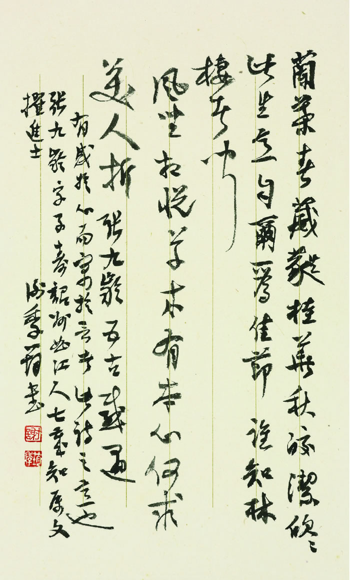 如今的谢季筠已经80高寿了。三十年后的他,传统书法的功底愈见深厚,风格更加突出,意境越发高远,作品呈现出散淡劲秀、沉着朴茂、浑厚而不板滞的书象,具有浓厚的书卷气息。谢先生的书法以行草书见长,是以“散逸”为总体特征的“川派书风”的代表。虽然书风呈散淡简远之态,但笔底却有一种生辣,这种生辣与变幻无定的用笔和结字组合,使得作品弥散着一股苍茫之气。今天,他携自己及弟子的书法代表作品287件,以“谢季筠书法展”、“此君书会(第二回展)”、“谢季筠师生书法选展”三展连台的方式,在杜甫草堂亮相一个月,从8月18日至9月12日。