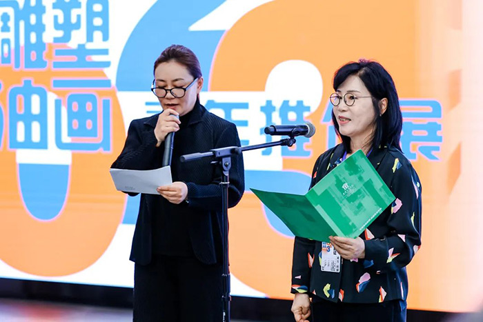 韩国雕刻家协会会长、韩国诚信女子大学名誉教授金姃熹教授致辞,中国雕塑学会理事、外联部部长、中韩展策展人郭航女士翻译