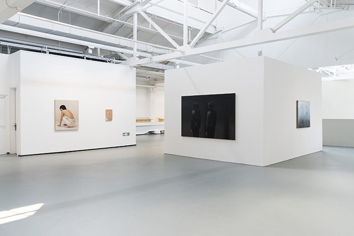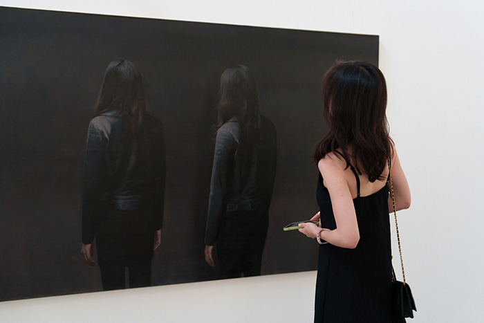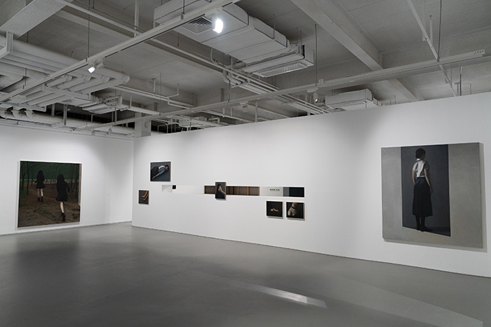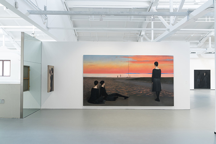 到达展览三层,中心区域被重构,围合出一间内观之屋,借助美术馆穹顶漫射下的自然光完成表达。三层的画作浓缩展现了薛若哲作品中闪避目光沟通的典型人物——回避着目光的交集,蔓延出一片虚无空袤的空间。展览由此完成了“目光”从外向的错杂、聚睛的凝视,再到缓缓内倾的过程,“内观”成为画面描绘之外画家自身的某种内视,也为观者提供了沉思的空间,留下的余味悠长。