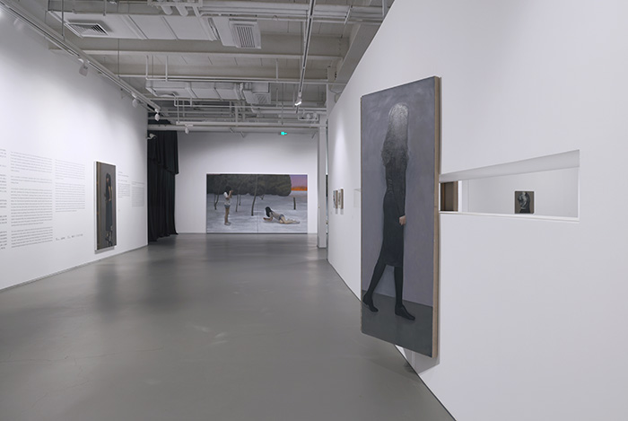 展览一层的空间布置显得迷蒙而交错,局部镂空,偶有镜面,配合着空间的错落表现出多面的观看视角,将视线范围整体与局部兼备。空间的设计与薛若哲的绘画本身相互呼应,同画面中的人物一同扭转、回避,协同构筑起介于真实与虚拟之间的时空,由此营造起“无从交汇”的目光。