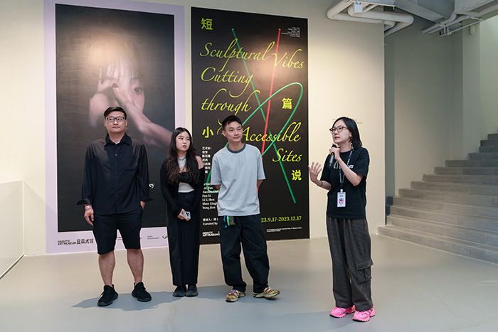群展“短篇小说”策展人、“早C晚A”橱窗项目发起人缪子衿致辞 左起:沈凌昊、陈若璠、蔡坚、缪子衿