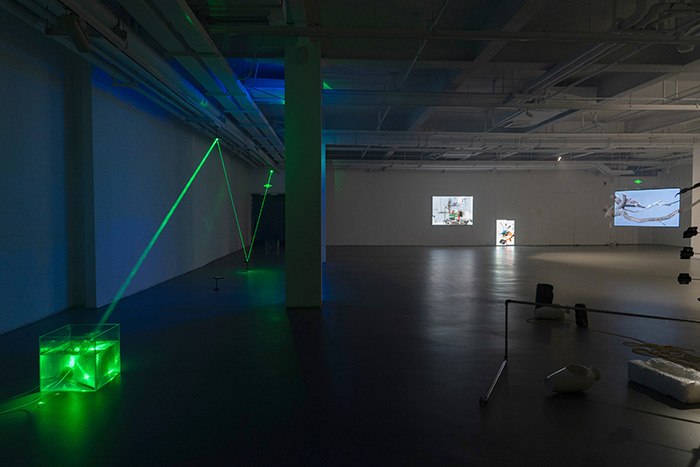 沈凌昊的作品《波动:赋格》绵延于狭长空间可能落成的体验。艺术家在美术馆的空间内进行创作,借助空间内的墙柱构造为初始材料搭建具备在地性与时间性的装置。观众们由此与作品进行互动,实时以各种姿态介入光线的运动,如同搅动图像生产路径的变量。《生成系统》则是杨健过去实现作品的重新引入,通过装置表达权力的分解与外部环境的规训,以人工唾液的循环为过程,构建某种暗喻的体系。