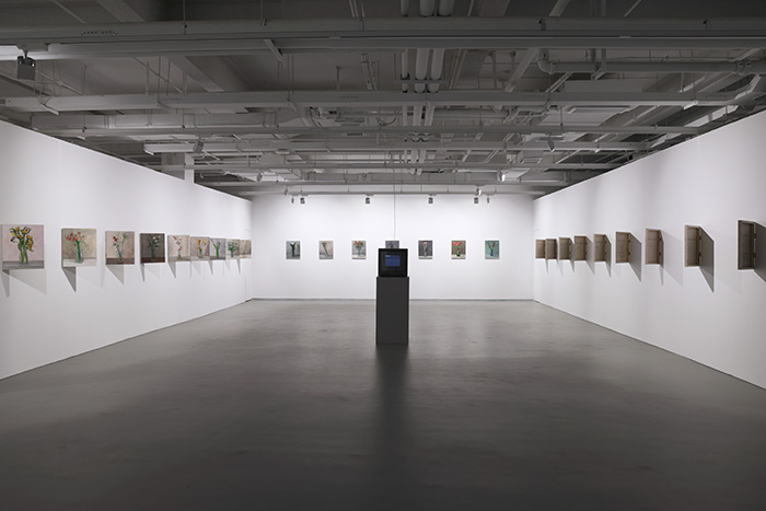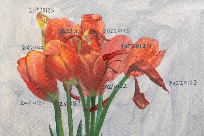 展览二层则是聚焦于薛若哲名为“YYYY-MM-DD”的系列作品。同规格的一系列静物花卉作品被以翻书的姿态陈设,画面中标示时间的数字清晰可见,勾勒出艺术家创作的时间逻辑,也可以从中映照出持续创作的姿态。据薛若哲分享,该系列作品同其小女儿出生开始,将一直持续到艺术家生命的终结,以绘画的方式完成日课以铭刻时间。