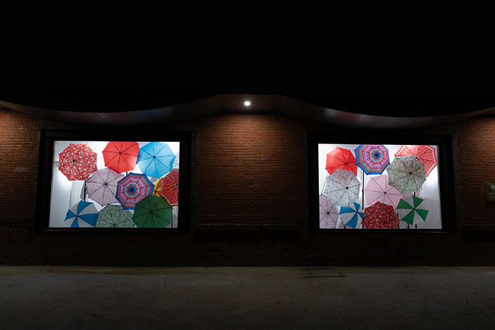 以上两个常规展览外,此次开幕也是重美术馆特别策划橱窗项目“早C晚A”正式开启。项目由季钰程、缪子衿发起,位于重美术馆户外橱窗,意在打造“不打烊”的24小时公共展示空间。第一期展览持续至10月28日,展出艺术家辛云鹏的装置作品。在如同双眼的两扇矩形橱窗内,艺术家挪用现成品的功能并以程序作用于闪光灯,带来自然而随机的变化;借助五颜六色的花伞向外投射光芒,造成对视者眼花缭乱的视觉逼迫。在这个昼夜不停的户外橱窗展示空间里,经过的人都会被迫接受这种“注视”,形成展览观看空间的延伸。