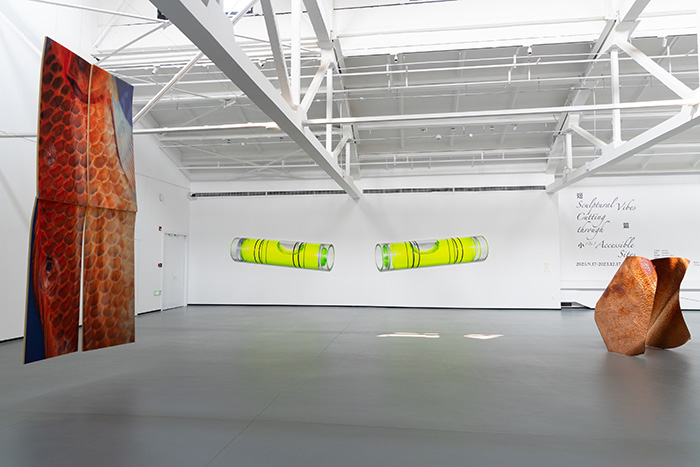 任莉莉的《落日如灼伤》散落在不时有天光倾洒的场景,附着于墙面以及地面的物件在观众徘徊的视线中交汇,栖居在记忆中的材料消失或重现,依靠内外翻转的形态、凝固的瞬间、近在咫尺的触觉,排演着缓慢的告别。从《水平-FG20230835007》到《水平-FG20230835008》,3D建模软件为蔡坚的系列绘画提供能够调整参数的写生图像。水平仪在这个概念上成为超出日常物具体意义的全新抽象图像,让观众在看似重复的左右画面之间产生观念的迟疑。