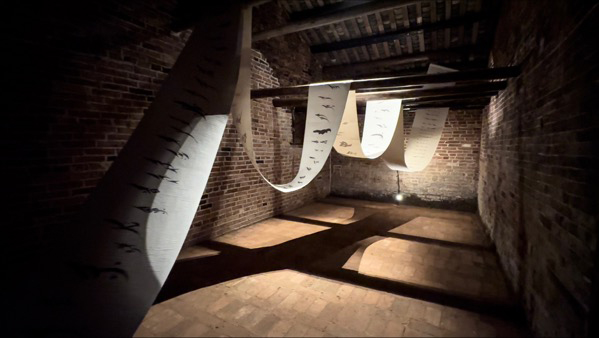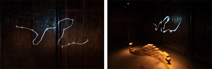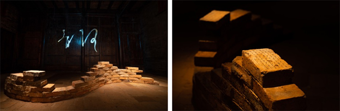 《声音的河流》展览现场 |女书传人胡欣在砖河上书写的女书