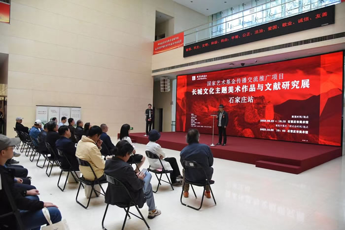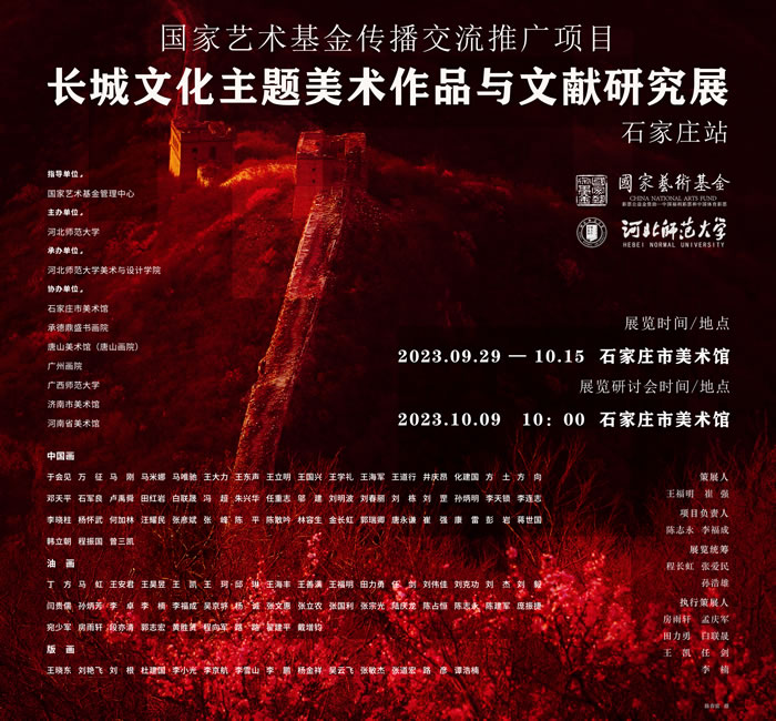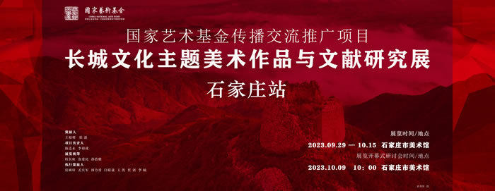 2023年10月9日上午10时,由国家艺术基金管理中心资助、指导,河北师范大学主办,河北师范大学美术与设计学院承办的国家艺术基金2023年度传播交流推广项目《长城文化主题美术作品与文献研究展》首展在石家庄美术馆开幕。