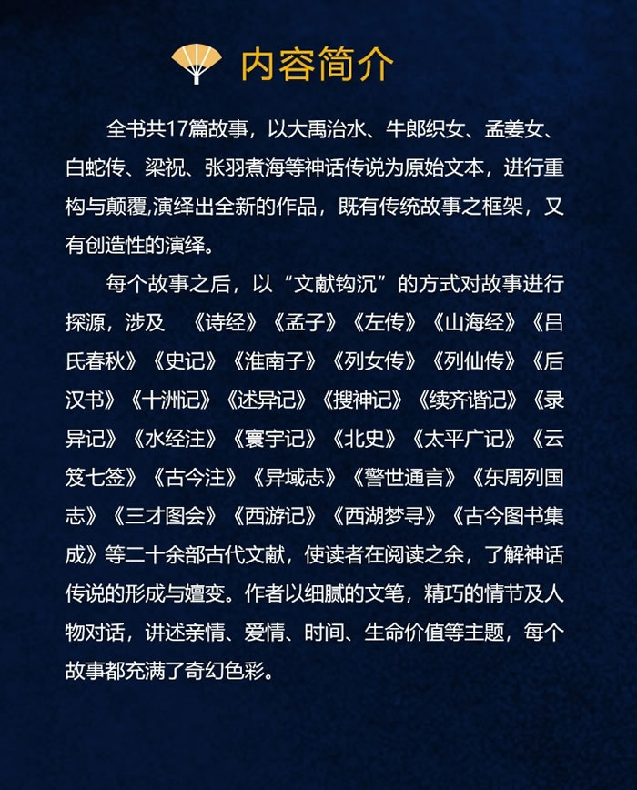 首先,该书所选故事具有广泛的群众基础和深厚的历史底蕴,既有鹊桥会、孟姜女哭长城等民间传说,还有大禹、弄玉公主等历史人物的神话故事。这些故事承载着民族的智慧和精神,为读者展示了一个多姿多彩的神话世界。并且每个故事之后,以“文献钩沉”的方式对故事进行探源,涉及《诗经》、《孟子》、《左传》、《山海经》、《吕氏春秋》、《史记》等二十余部古代文献,使读者在阅读之余,了解神话传说的形成与嬗变。
